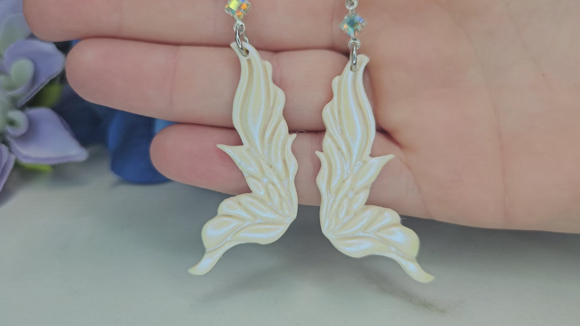 Add a touch of magic to your look with these handcrafted Celestial Pearl Fairy Wing Earrings. Made from lightweight, shimmering polymer clay, these ethereal earrings feature intricate wing detailing and a soft pearlescent finish that catches the light beautifully.