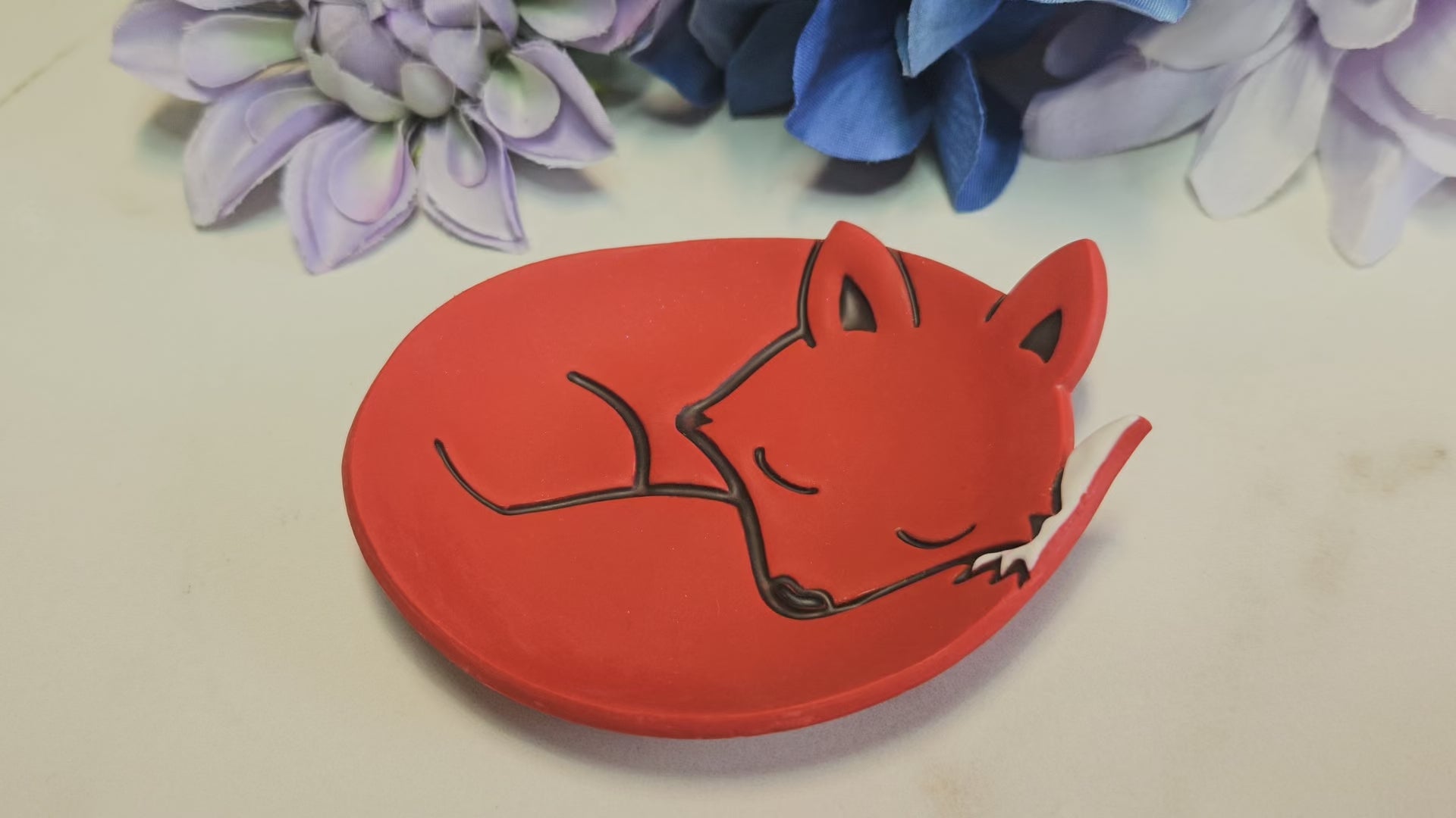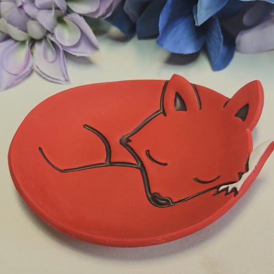 Keep your treasures safe with the cozy charm of this fox trinket dish. Handcrafted from polymer clay, this adorable dish features a curled-up red fox peacefully dozing with a tiny white-tipped tail that hugs the edge of the dish. Its simple, minimalist design adds a sweet woodland touch to any dresser, nightstand, or altar space.
