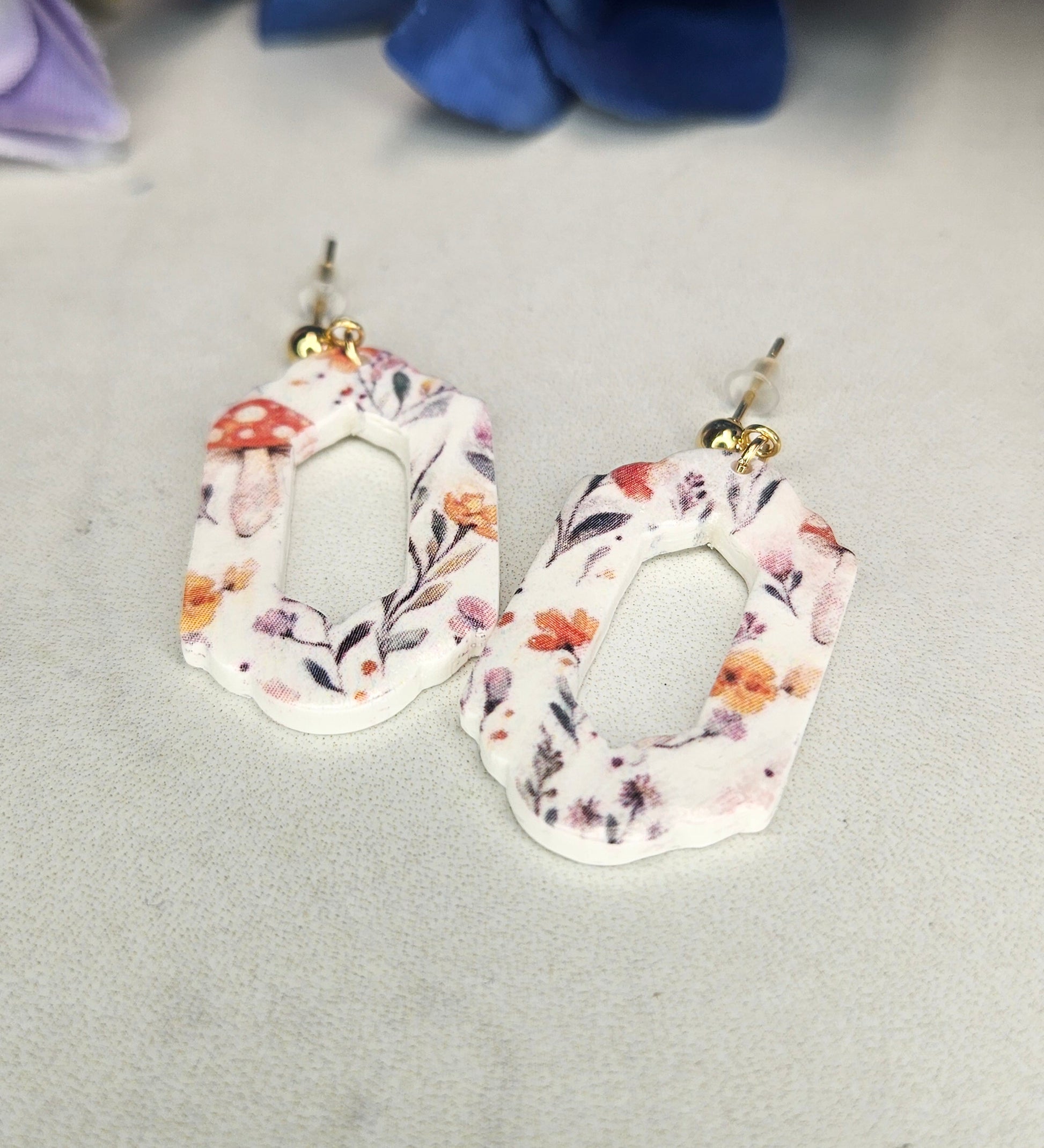 Peek into a dreamy forest day with these handcrafted polymer clay earrings, featuring a soft floral pattern and a hidden toadstool peeking through the design. The unique arch shape adds a vintage-inspired flair, making these earrings perfect for nature lovers, fairycore fans, and anyone drawn to woodland whimsy.