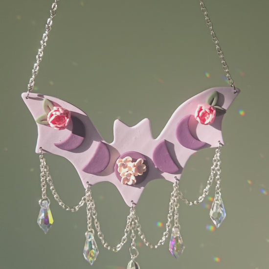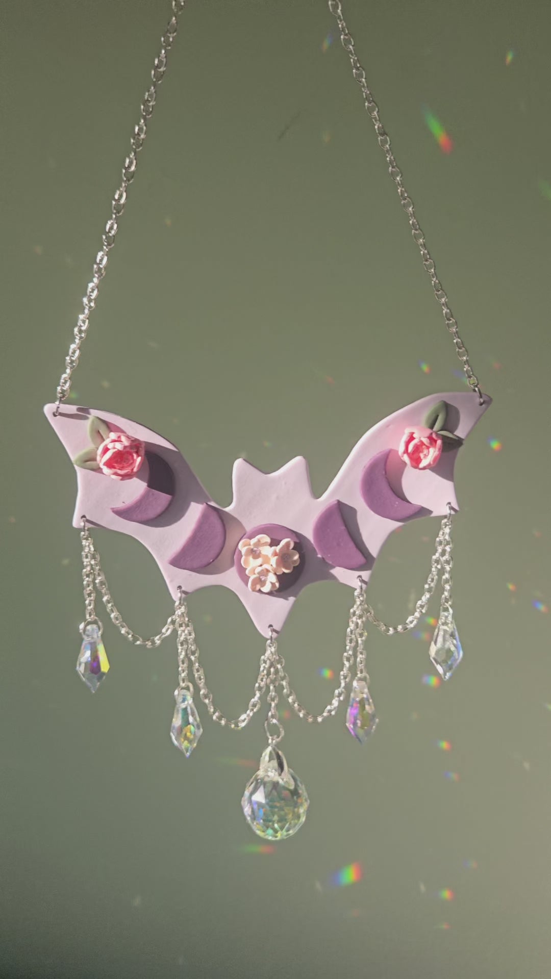 Bring a touch of gothic whimsy and lunar magic to your space with this handmade bat-shaped suncatcher. Featuring a mystical moon phase design and delicate pastel florals, this unique piece is adorned with sparkling crystal prisms that catch the light and cast enchanting rainbows across your room. Finished with silver-toned chain draping and handcrafted polymer clay roses, it’s perfect for witchy decor lovers, fantasy fans, and cottagecore souls alike.